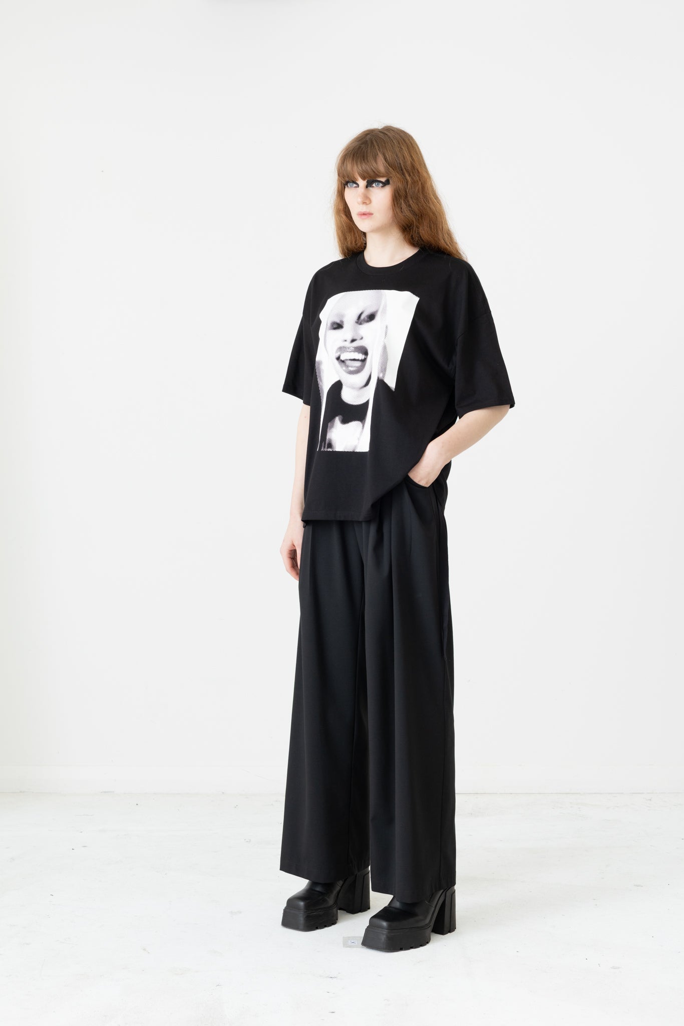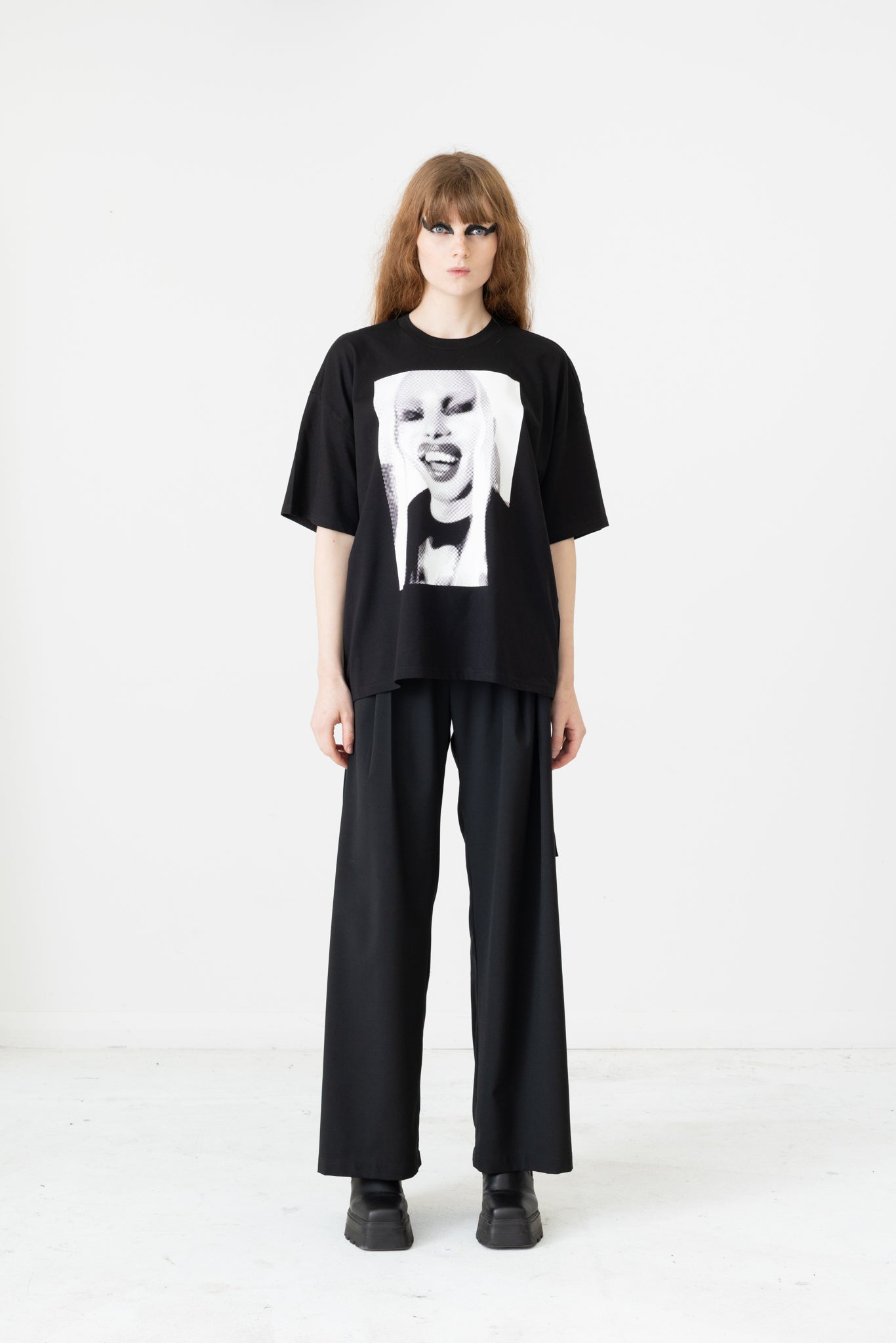 This LEGENDARY tee features our (dare we say it?) iconic "Halftone Jimmy" print from our 2021 "EGO TRIP" collection, featuring the Jimmy D designer mid laugh, resplendent in full gender-bending makeup warped by a filter.
