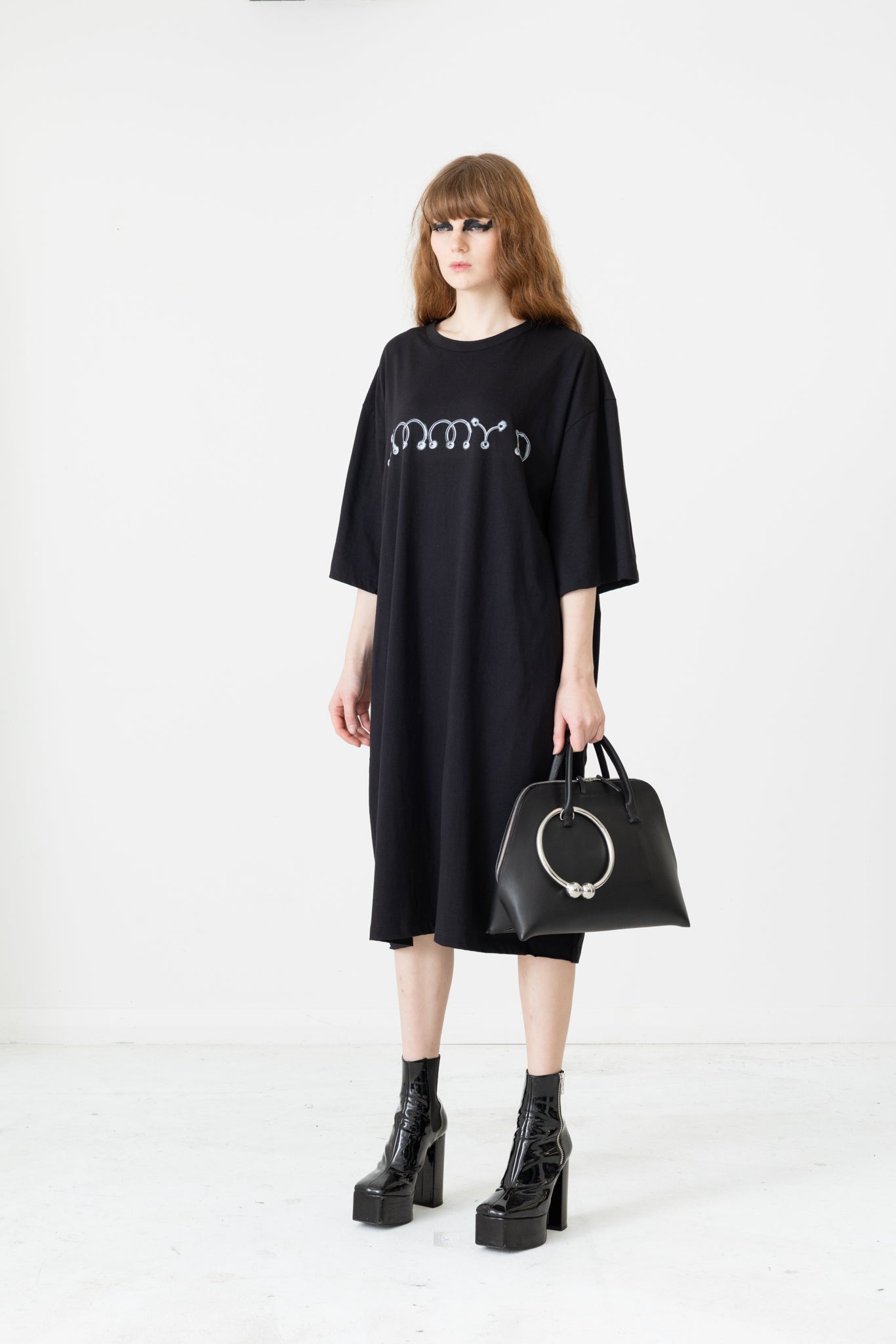This tee features our "Barbell Jimmy" print. Every season we like to reimagine the Jimmy D logo, this season with our obsession for everything metal and 90's we decided to fashion our logo out of different shaped barbell piercings.